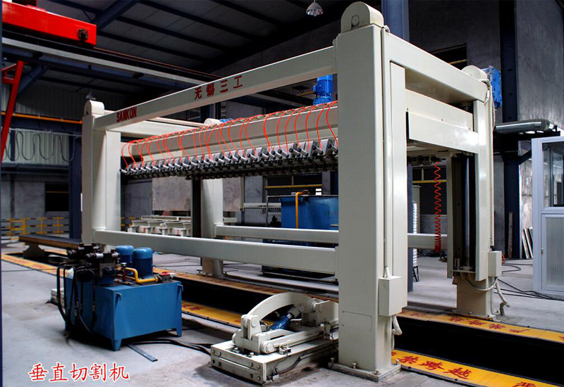 當(dāng)澆注好的模坯在空中翻轉(zhuǎn)90°吊至切割小車,脫去??蚝螅傻谝徊壳懈钚≤囕d運(yùn)至縱切機(jī)、橫切機(jī)工位對坯體進(jìn)行六面切割。首由縱切機(jī)對坯體進(jìn)行縱向、水平四面切割,完成后由切割車載運(yùn)坯體停留在橫切機(jī)工位,完成后經(jīng)液壓頂升裝置上升抬起胚體,第一部切割小車退回初始位置準(zhǔn)備運(yùn)載下一模胚體,以備切割。第二部切割小車行至橫切機(jī)位置,液壓頂升裝置下降將坯體放至第二部切割小車上,然后由橫切機(jī)對坯體進(jìn)行垂直切割,切割完成后仍由第二部切割車運(yùn)載坯體運(yùn)行至半成品吊具下方,由半成品吊具將坯體吊到蒸養(yǎng)車,此時(shí)第一部小車可載運(yùn)坯體作下一模切割。切割周期約4min。