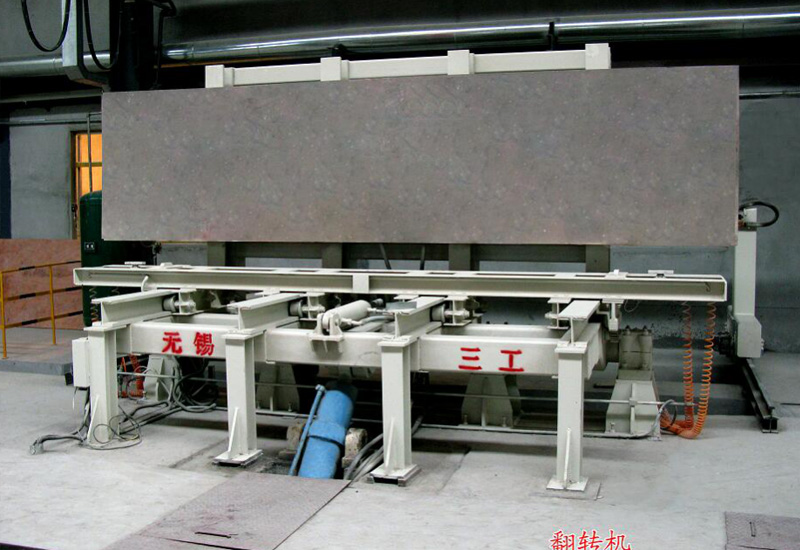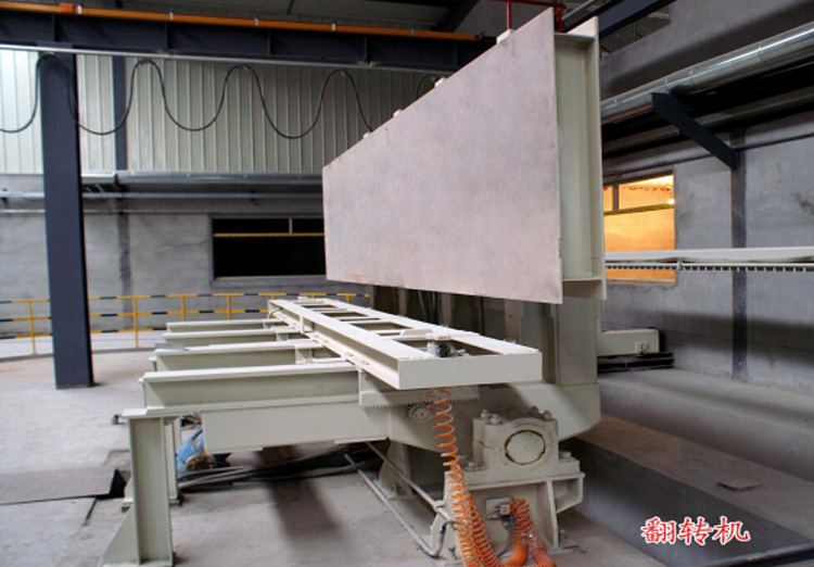 加氣磚成套生產(chǎn)線中用到的一種翻轉(zhuǎn)設(shè)備,翻轉(zhuǎn)臺,主要是加氣線里面,切割完成后,坯體經(jīng)由翻轉(zhuǎn)臺90度翻轉(zhuǎn),再刮廢料機(jī)刮除坯體頂部和底部的廢料。