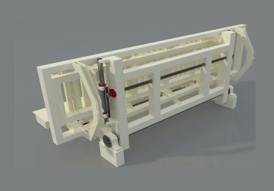 坯體切割底面會有一些廢料。翻轉(zhuǎn)臺將坯體在翻轉(zhuǎn)架上轉(zhuǎn)過90°后,坯體底面切割的表皮由水平位置轉(zhuǎn)變成垂直位置,在重力作用下,自動脫落,坯體表面廢料被去除。翻轉(zhuǎn)臺全部采用液壓驅(qū)動。翻轉(zhuǎn)油缸還具有終點緩沖性能。為了保證蒸養(yǎng)底板、側(cè)板在翻轉(zhuǎn)過程中的穩(wěn)固性,在它們處于翻轉(zhuǎn)位置時側(cè)面都設(shè)有鎖緊機(jī)構(gòu)。